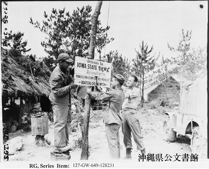 【和訳】 (左から)海兵隊予備役パーマー中尉(第3水陸両用軍団の写真係の指揮官)が指示し、同予備役ナルバンコ1等兵が「アイオワ・ステイト・ピクニック」の看板を掲げ、同予備役スミス3等軍曹が眺めている。