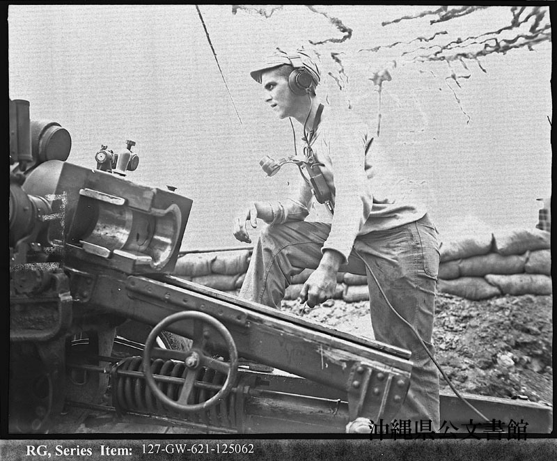 【和訳】 「発射」の指示を待っているミリガン米海兵隊砲兵伍長。小禄半島の塹壕にいる日本兵に壊滅的打撃を与える105ミリ砲の引き綱を手にして、綱を引く構えをとっている。彼もマーシャル諸島やグアムでの戦闘に従軍した