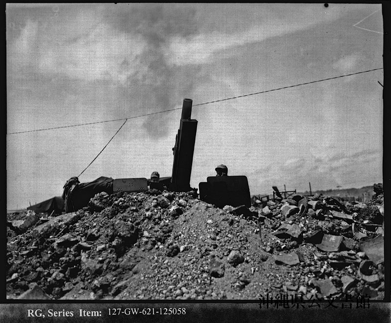 【和訳】 廃墟と化した那覇市内の陣地から高角射撃を行う、ラッキー大佐率いる第15海兵連隊の105ミリ榴弾砲。この種の砲撃は、日本軍が潜んでいる小禄半島の高地背面部に対してよく行なわれる