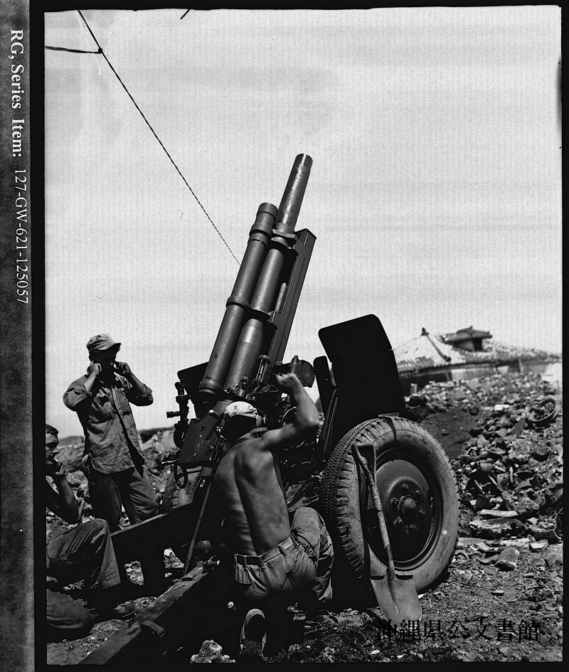 【和訳】 焦土と化した那覇市内の陣地から高角射撃を行っているのは、ラッキー大佐率いる米海兵隊第15連隊の105ミリ榴弾砲。この種の砲撃は、日本軍が陣地を構築した小禄半島高地の背面部攻撃に用いられている