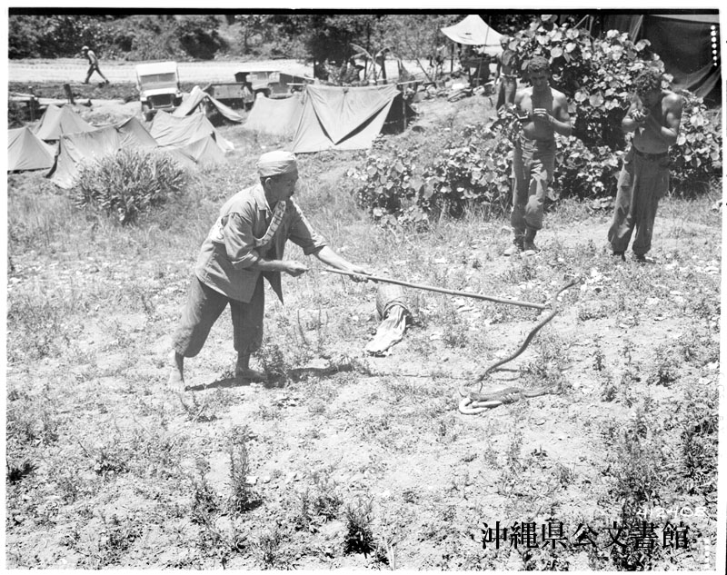 【和訳】 軍政府の職員にハブの扱い方を見せる仲尾出身のハブ捕り名人比嘉カマド