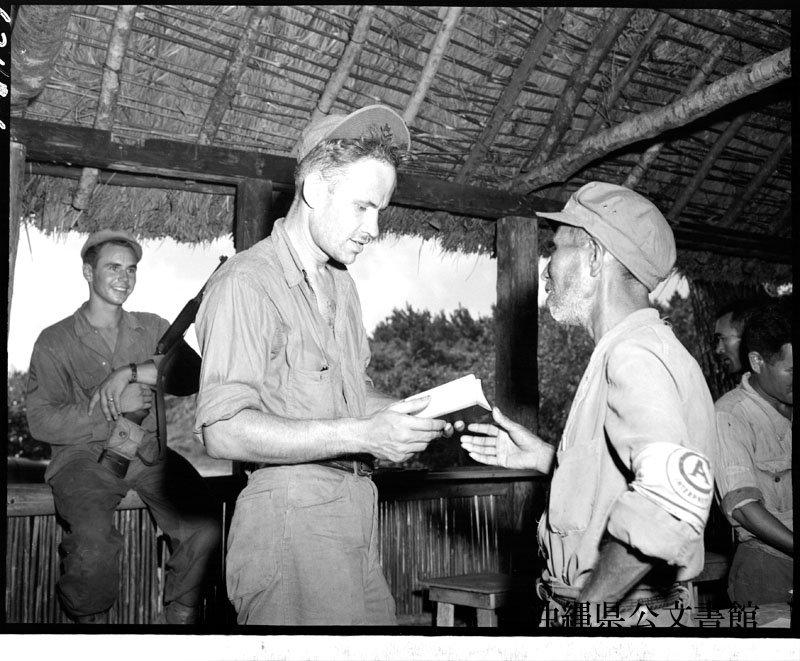 【和訳】 通訳と会話するマークハム撮影要員。沖縄本島にて。