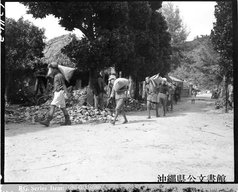 【和訳】 袋に入った米を運ぶ少年。沖縄本島にて。