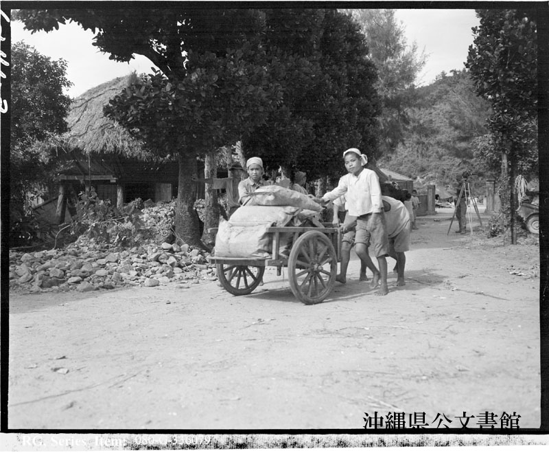 【和訳】 袋に入った米を運ぶ少年。沖縄本島にて。