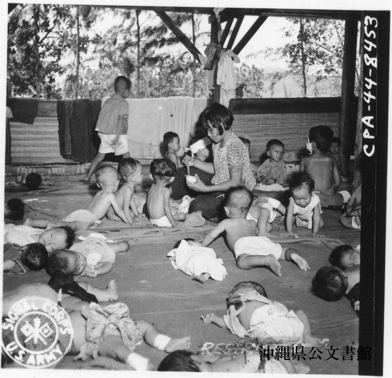 【和訳】 第27歩兵師団の病院施設で、たくさんの日本人の赤ん坊が眠り、這い、泣き声をあげている。サイパン島にて。