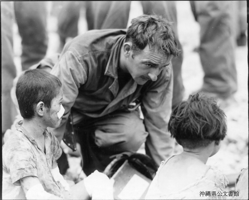 【和訳】 連隊のパトロールで収容した子供たちに話しかけるイリノイ州シカゴ市ロスコ―通り5306番地出身で第4海兵師団のハリー・ジムニー軍曹。子供たちはサイパンの北端にあるマルピポイント飛行場の下端にある壕から出された。同日午後、子供らの両親の何名かは海兵隊のパトロールで収容された。