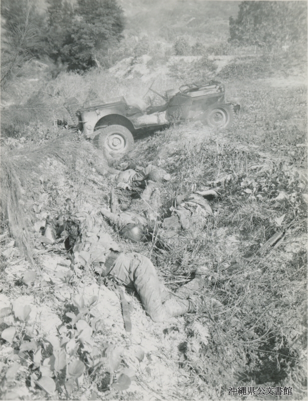 【和訳】 ハラキリ自決 - アメリカ軍の砲撃でバラバラになった日本兵(写真手前)。他の3人の日本兵は自ら命を絶った。その死と自決は、先に死に物狂いの反撃に遭って燃え盛る米軍ジープのそばで発生した。日本兵はその後まもなく押し戻され、一掃された。