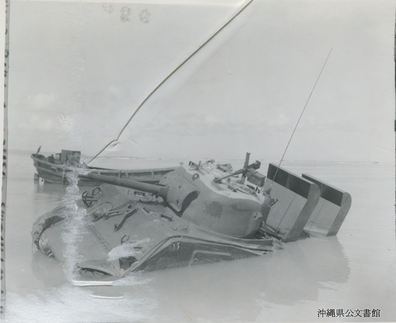 【和訳】 浜辺で動かなくなった海兵隊の戦車。後方に日本軍の上陸船。