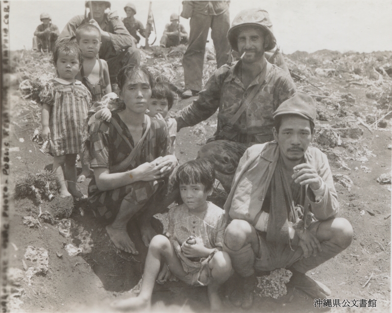 【和訳】 ビクター・"トランスポート"・メガキアン一等軍曹(妻がカリフォルニア州フレズノ、バルチ通り3135番地に居住)と洞窟の中に隠れているのを発見され、海兵隊が連れたチャモロ人ガイドに出てくるように促された日本兵とその家族。