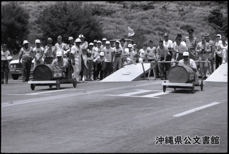 Civil Administrator Stanley S. Carpenter (R), and Maj. Gen. J. D. Page, commanding general, 313th Air Division, start the first heat of the "Oil Can Derby" preceding the annual Soap Box Derby held on the hill inside Kadena Air Base Gate 1, July 13. Derby winner was Col. Thomas C. Murphy, Kadena Air Base Commander. ≪嘉手納航空基地第一ゲート内の丘で7月13日、石鹸箱ダービーの前に行われた石油缶ダービーで、第一試合に出場したスタンリー S. カーペンター民政官(右)と、第313空軍師団司令官J.D. ページ少将。このダービーは嘉手納飛行基地司令官トーマス. G. マーフイ大佐が優勝した。≫ 【和訳】