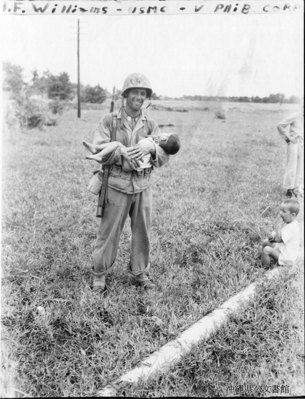 【和訳】 日本人の赤ん坊を抱く海兵隊員。一人の民間人があまりにも多くの子供を抱いていたのでこの兵隊が代わりに抱えてあげている。彼はニュージャージー州モントクレアのW・A・タファロ伍長。