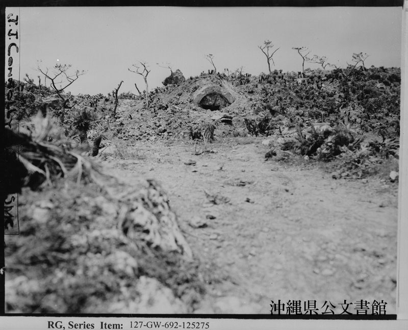 【和訳】 小禄半島--屋良座のすぐ南西の丘にある、日本軍の120ミリ砲が据えられた大きな砲座。