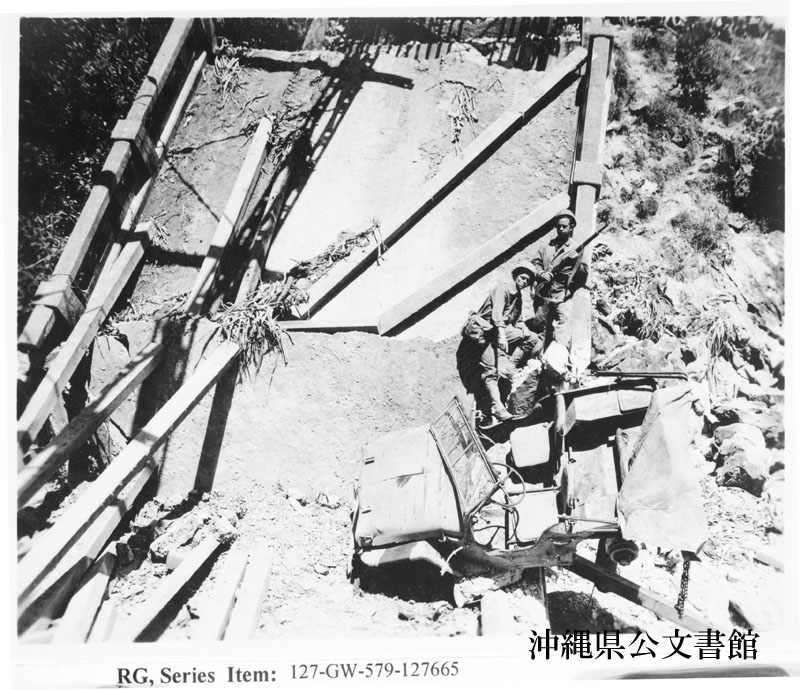【和訳】 名護—渡久地間の海岸道路沿いに架けられ、崩壊した橋の一部
