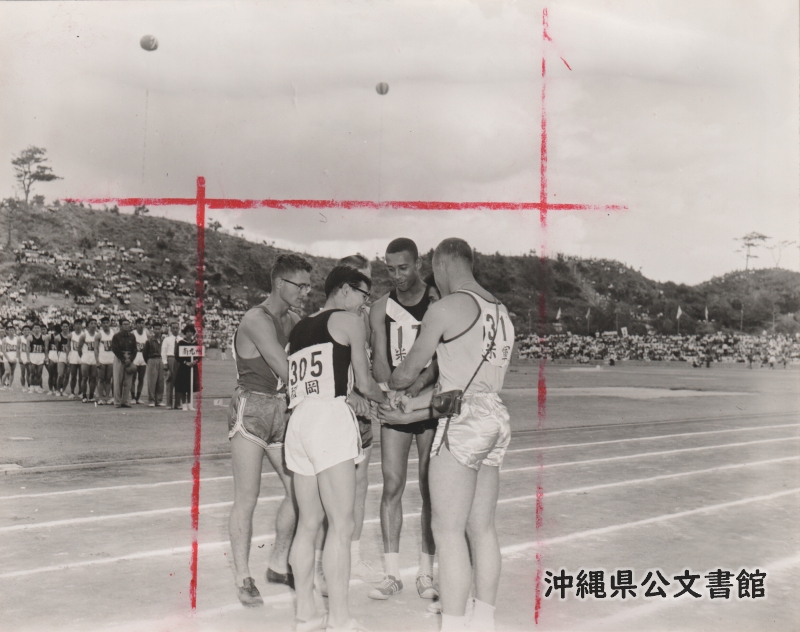 TRIANGULAR FRIENDSHIP TRACK AND FIELD MEET -- U.S. Forces-Kyushu-Ryukyus triangular friendship track and field meet was held at the Nago athletic field (northern Okinawa) on Nov. 7. In the opening ceremony, chairman Kan Yasukawa of the Kyushu Inter-Prefectural Field and track meet, expressed appreciation for the cooperation of the U.S. Forces and expressed hope that the event will prove to be of great significance for U.S.-Japan-Ryukyus friendship. U.S. High Commissioner Lt. Gen. Donald P. Booth, said in an address, "there is no better way to overcome the barriers of language and culture than on the athletic field." PHOTO -- Representatives of each team shown shaking hands before the meet. 【和訳】名護陸上競技場で開催された米軍-九州-琉球の三者親善陸上競技大会 三者親善陸上競技大会 - 米軍・九州・琉球の三者陸上競技大会が11月7日、名護陸上競技場(沖縄北部)で開催された。開会式では九州各県対抗陸上競技大会のヤスカワ・カン会長が、米軍の協力に対する謝意を表すとともに、この大会が米国・日本・琉球の親善に大きな意義を持つことを期待すると述べた。また米国民政府ドナルド・P・ブース高等弁務官はあいさつで「言語や文化の壁を乗り越える方法として、競技場に勝るものはない」と述べた。写真は、各チームの代表者が大会開始前に握手を交わす様子。