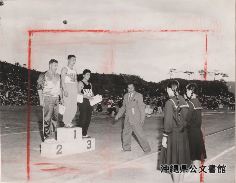 TRIANGULAR FRIENDSHIP TRACK AND FIELD MEET -- U.S. Forces-Kyushu-Ryukyus triangular Friendship Track and Field Meet was held at the Nago athletic field (northern Okinawa) last Nov. 7. In the opening ceremony, chairman Kan Yasukawa of the Kyushu Inter-Prefrectural [Prefectural?] Field and Track Meet, expressed appreciation for the cooperation of the U.S. Forces and expressed hope that the event will prove to be of great significance for U.S.-Japan-Ryukyus friendship. U.S. High Commissioner, Lt. Gen. Donald P. Booth, said in an address, "there is no better way to overcome the barriers of language and culture than on the athletic field". 【和訳】名護陸上競技場で開催された米軍-九州-琉球の三者親善陸上競技大会 三者親善陸上競技大会 - 米軍・九州・琉球の三者陸上競技大会が去る11月7日、名護陸上競技場(沖縄北部)で開催された。開会式では九州各県対抗陸上競技大会のヤスカワ・カン会長が、米軍の協力に対する謝意を表すとともに、この大会が米国・日本・琉球の親善に大きな意義を持つことを期待すると述べた。また米国民政府ドナルド・P・ブース高等弁務官はあいさつで「言語や文化の壁を乗り越える方法として、競技場に勝るものはない」と述べた。