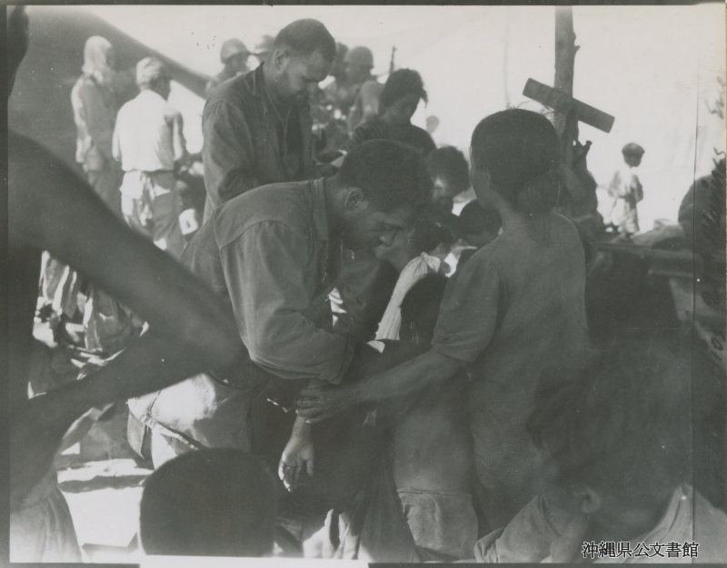 【和訳】 診療所で行われる捕虜の治療。 女の子の腕の手当てをする海兵隊員。