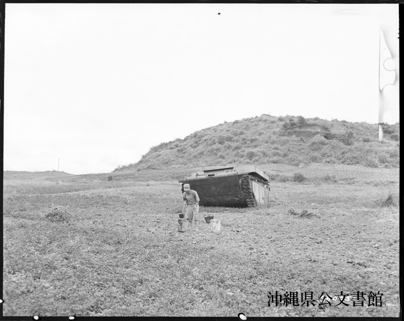 【和訳】 沖縄戦の激戦地の一つシュガーローフ・ヒル(安里と真嘉比の間の高地)のふもとに放置された上陸用舟艇の踏み板の所まで広がる甘藷畑に肥料をまく農夫