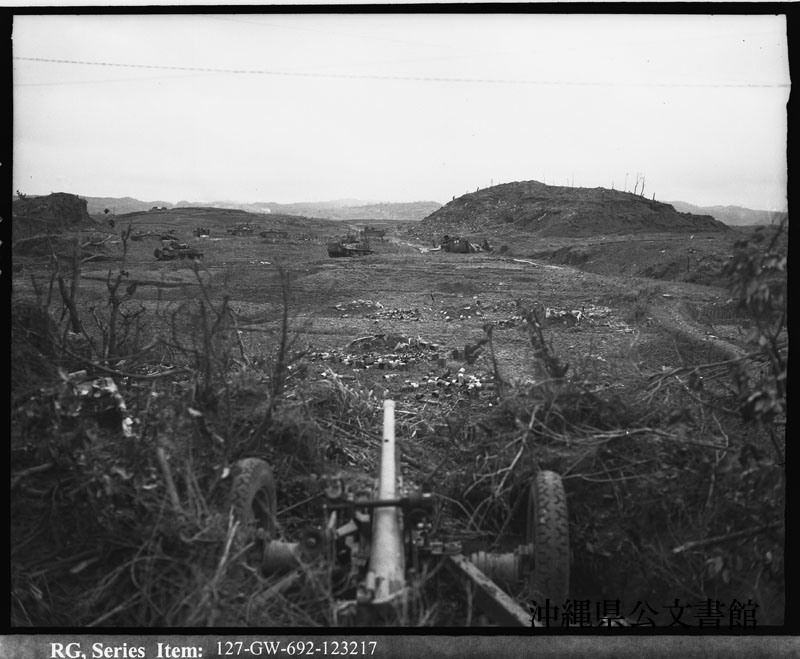【和訳】 有名な“シュガーローフ・ヒル”の眺め。手前には日本軍の47ミリ砲がある。ここは沖縄戦で最も血なまぐさい戦いが繰り広げられた場所である。