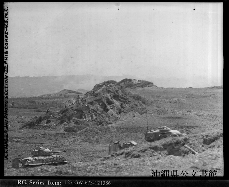 【和訳】 シュガーローフ・ヒルに接近している海兵隊員が、高台で足留めを食らっている。