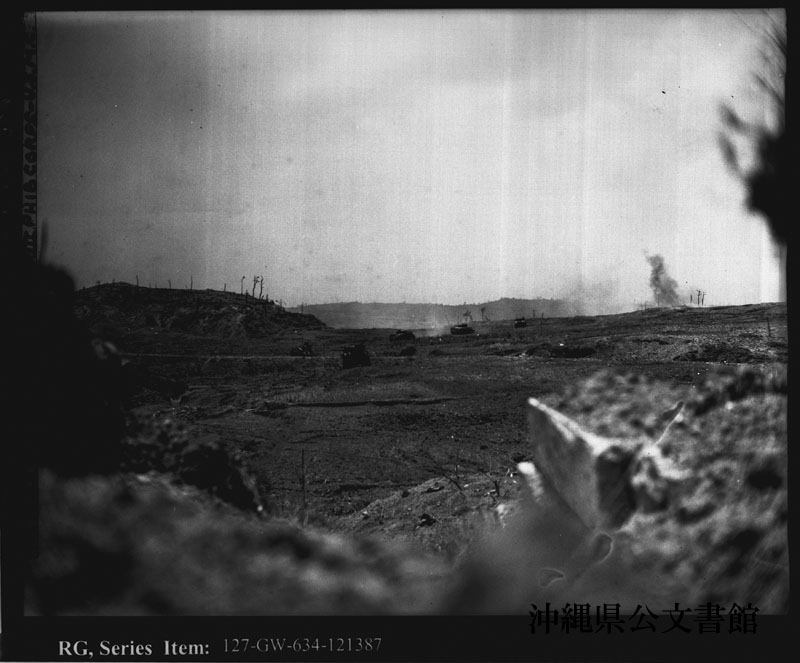 【和訳】 第22海兵連隊戦線の左側に位置するシュガーローフ・ヒルの眺望。撮影時、第29海兵連隊は、この丘を攻撃していた。丘の右側に近づく戦車が写っている。