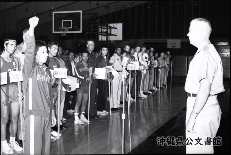 11TH ANNUAL RYYKYUAN-AMERICAN FRIENDSHIP BASKETBALL LEAGUE -- Captain Keiei Matayoshi (L), Okinawa Suisan Senior High School's basketball team, takes an oath of fair play before Col. H. N. Gilbert, acting chairman of Community Relations Committee in the Naha and Urasoe Area at the opening ceremony of the 11th Annual Ryukyuan-American Friendship Basketball League. The ceremony was held at the Stilwell Field House in Sukiran Nov. 20 with 27 teams present, including 23 Ryukyuan high school teams and four American teams . They will compete for the trophy to be donated by the High Commissioner to the winning team on Feb. 3. 【和訳】琉米高校バスケットボール大会 第11回琉米親善バスケットボールリーグ開会式で那覇・浦添地区地域交流委員会H・N・ギルバート大佐(右)に、選手宣誓を行う沖縄水産高校バスケットボール部主将のマタヨシ・ケイエイ(左)。開会式は11月20日に瑞慶覧のスティルウェル・フィールドハウスで行われ、琉球から23校、アメリカ側4校の計27チームが参加した。翌年2月3日に高等弁務官から優勝チームへ授与されるトロフィーを懸けて競い合う。
