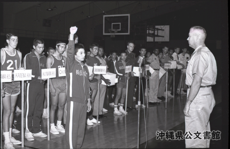 11TH ANNUAL RYYKYUAN-AMERICAN FRIENDSHIP BASKETBALL LEAGUE -- Captain Keiei Matayoshi (L), Okinawa Suisan Senior High School's basketball team, takes an oath of fair play before Col. H. N. Gilbert, acting chairman of Community Relations Committee in the Naha and Urasoe Area at the opening ceremony of the 11th Annual Ryukyuan-American Friendship Basketball League. The ceremony was held at the Stilwell Field House in Sukiran Nov. 20 with 27 teams present, including 23 Ryukyuan high school teams and four American teams . They will compete for the trophy to be donated by the High Commissioner to the winning team on Feb. 3. 【和訳】琉米高校バスケットボール大会 地元Bチーム 第11回琉米親善バスケットボールリーグ開会式で那覇・浦添地区地域交流委員会H・N・ギルバート大佐(右)に、選手宣誓を行う沖縄水産高校バスケットボール部主将のマタヨシ・ケイエイ(左)。開会式は11月20日に瑞慶覧のスティルウェル・フィールドハウスで行われ、琉球から23校、アメリカ側4校の計27チームが参加した。翌年2月3日に高等弁務官から優勝チームへ授与されるトロフィーを懸けて競い合う