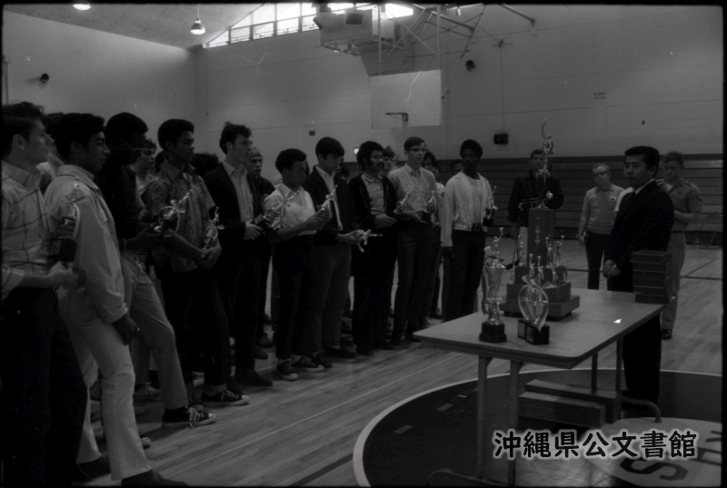 14TH ANNUAL RYUKYUAN-AMERICAN HIGH SCHOOL BASKETBALL LEAGUE -- Eight Ryukyuan and American high school basketball teams competed for the island-wide championship in the 14th annual Ryukyuan-American high school basketball league, Dec. 3, 1970 through Feb. 27, 1971. The teams which participated in the finals were two Ryukyuan teams from Futenma and Koza high schools, four Kubasaki High School (KHS) teams representing Naha, Machinato, Sukiran, and Kadena areas, and teams from the Okinawa Christian and Christ the King schools. The KHS team from Kadena area won the 1971 island-wide championship and was presented the High Commissioner's perpetual trophy by the league chairman Col. Clarke S. Vaughn, commanding officer, Strategic Communication Command, at the closing ceremony held at the KHS gymnasium, March 12. The league was sponsored by the Okinawa High School Athletic Association; U.S. Army, Ryukyu Islands; USCAR's Public Affairs Dept.; and the Ryukyuan-American Sports Committee. ≪第14回琉米高校バスケットリーグ戦 - 第14回琉米高校バスケットリーグの決勝戦は沖縄側から普天間とコザの両高校チーム、クバサキ米人学校から那覇、マチナト、ズケラン、カデナの四チーム、並びに沖縄クリスチャンスクール及びクライストキングスクールの計8チームの間で去る12月3日から今年の2月27日まで行なわれた。試合の結果、クバサキ米人学校のカデナチームが1971年の全琉チャンピオンとなり、3月12日、クバサキ米人高校の体育館で行なわれた閉会式で大会実行委員会委員長クラーク・S・バーン大佐(戦略通信隊司令官)から高等弁務官トロフィーが贈られた。同リーグは沖縄高校体育連盟、在沖米陸軍、民政府広報局、並びに琉米親善スポーツ委員会の主催で行なわれた。≫【和訳】スティルウェル・フィールド・ハウス