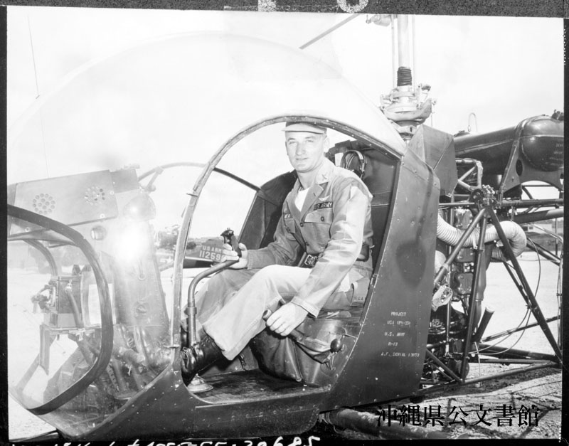 【和訳】 第75RCTのH-13型ヘリで瑞慶覧飛行場から離陸の準備をするパイロットのブック中尉