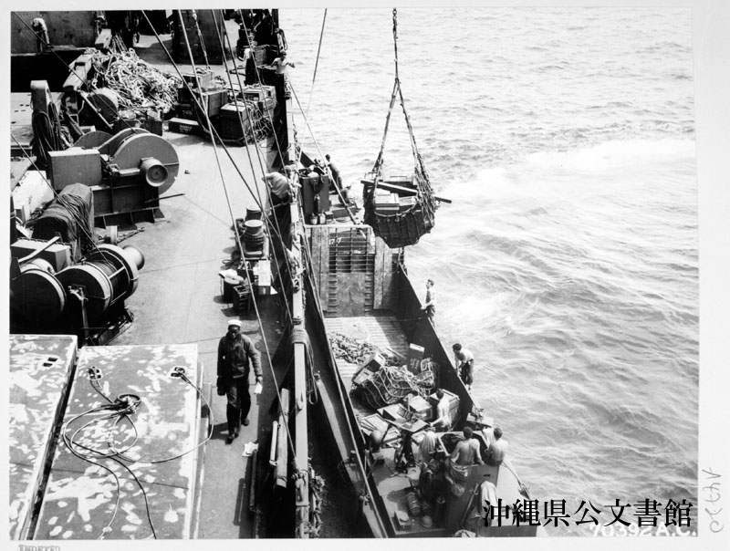 【和訳】 沖縄の海岸へ運ぶため、第41爆撃群のための補給物資を沿岸警備隊貨物船AK-17の船倉から機械化部隊上陸用舟艇に移す。