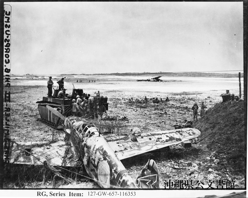 【和訳】 壊さないのなら利用すべし--読谷飛行場の海兵隊は、水陸両用トラクターから物資を下ろすと、飛べなくなった日本軍機の翼を傘にして、その下に保管した。このような光景は、沖縄中で活動する第3海兵水陸両用軍団の間ではよく見られた。後方には休憩する海兵隊員と、飛べなくなった他の日本軍機。