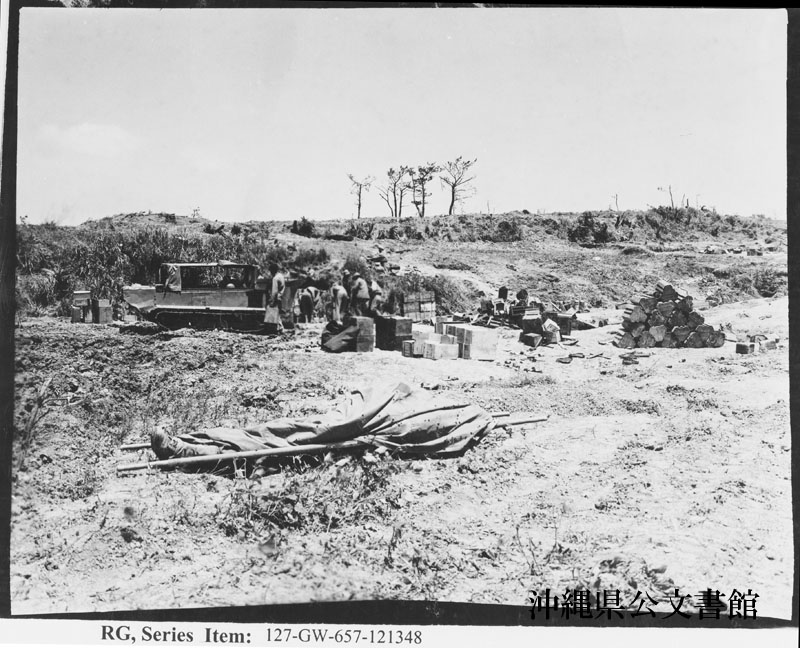【和訳】 戦線までの150ヤード内にウィーゼル車で運び込まれた物資。手前に見える海兵隊員の死体は、ウィーゼル車が戻る際に収容される。