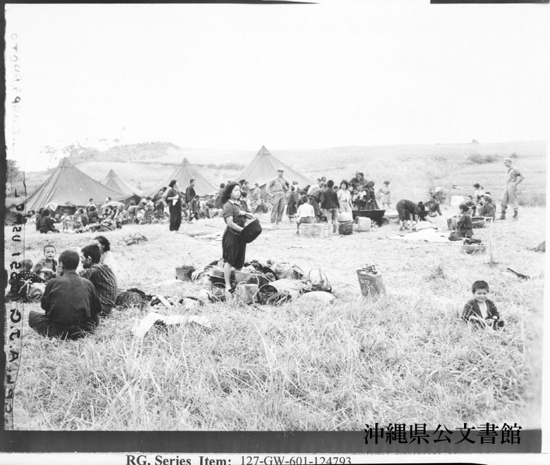 【和訳】 沖縄本島南部にある民間人収容所。海兵隊はテントを供給し、特に必要とされている医療器具を与え医療措置を施した