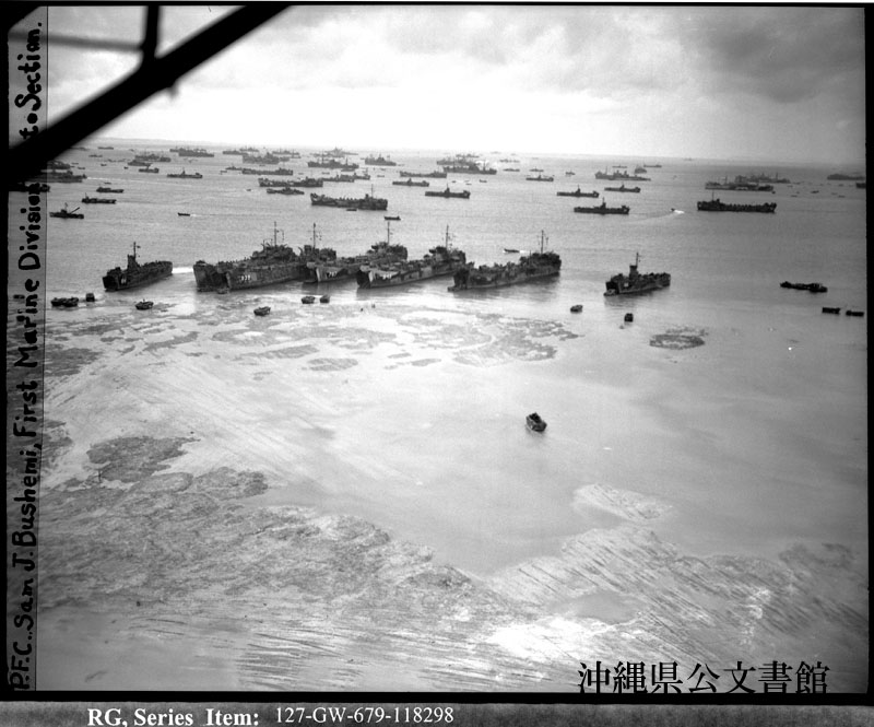 【和訳】 揚陸艇の荷下ろし−補給物資を降ろす揚陸艦5隻と機動揚陸艇2隻。後方の艦船も、補給物資の荷下ろしのため、車両兵員揚陸艇と水陸両用車両を待っている。