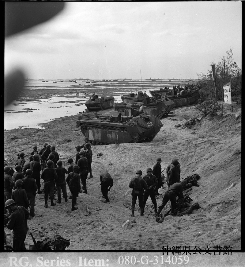 【和訳】 沖縄の海岸に揚陸される米軍部隊や補給物資。
