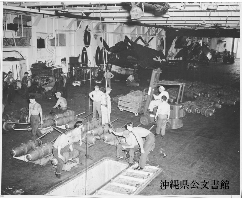 【和訳】 弾薬と物資の積み込み。米艦船スワニー号でクレーン車を操縦するリンド空軍少佐