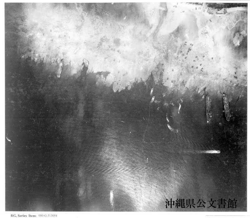 【和訳】 読谷近くで物資を降ろしている揚陸艇の空中写真。