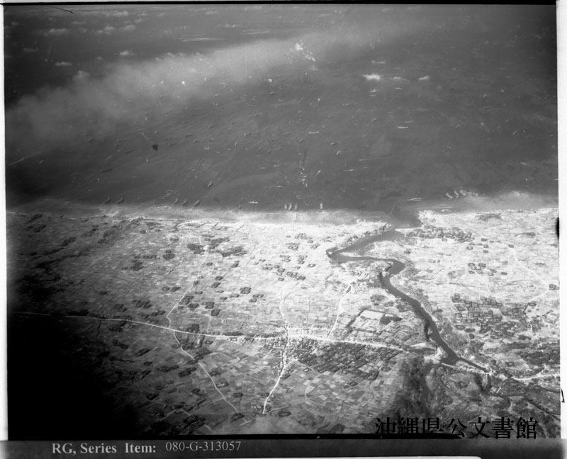 【和訳】 読谷近くで物資を降ろしている揚陸艇の空中写真。