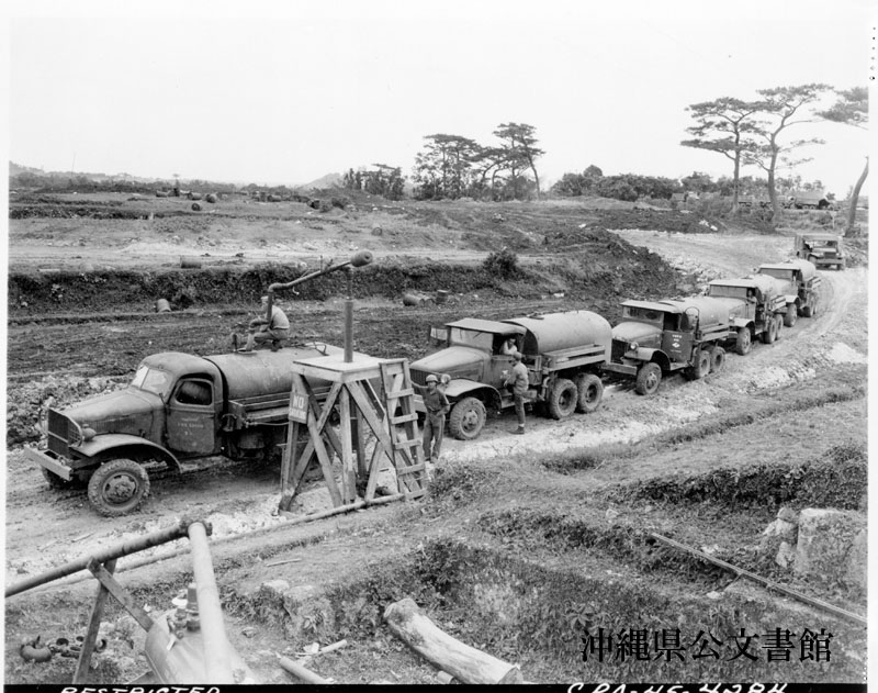 【和訳】 パイプラインで作業する兵士と海岸から貯蔵タンクへ石油を輸送するタンカー等