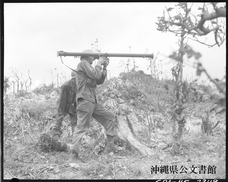 【和訳】 バズーカ砲を構えるフィッシャー一等兵と弾を装填するミラー一等兵。彼らは日本軍壕に向かって発砲しようとしている