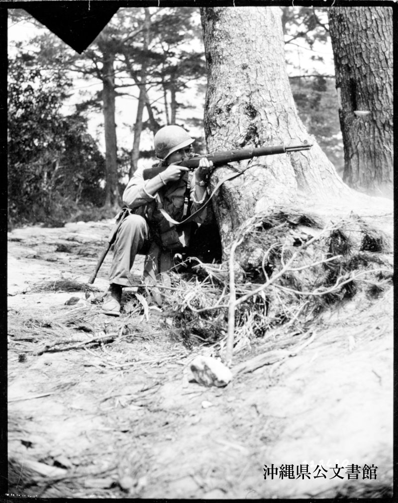 【和訳】 “ヤンク“掲載の通信隊写真/琉球での前進を阻んでいる敵の機関銃陣地に向けて発砲する歩兵