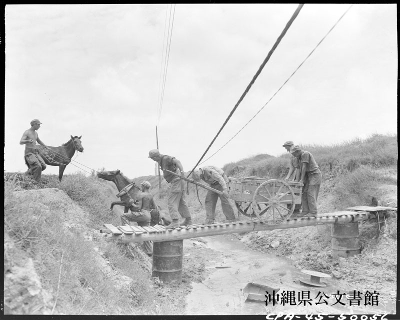 【和訳】 他の兵士が馬を先導する間、馬車を引いて仮設橋を渡る第776水陸両用戦車大隊C中隊の兵士。馬車も馬も現地で調達された。