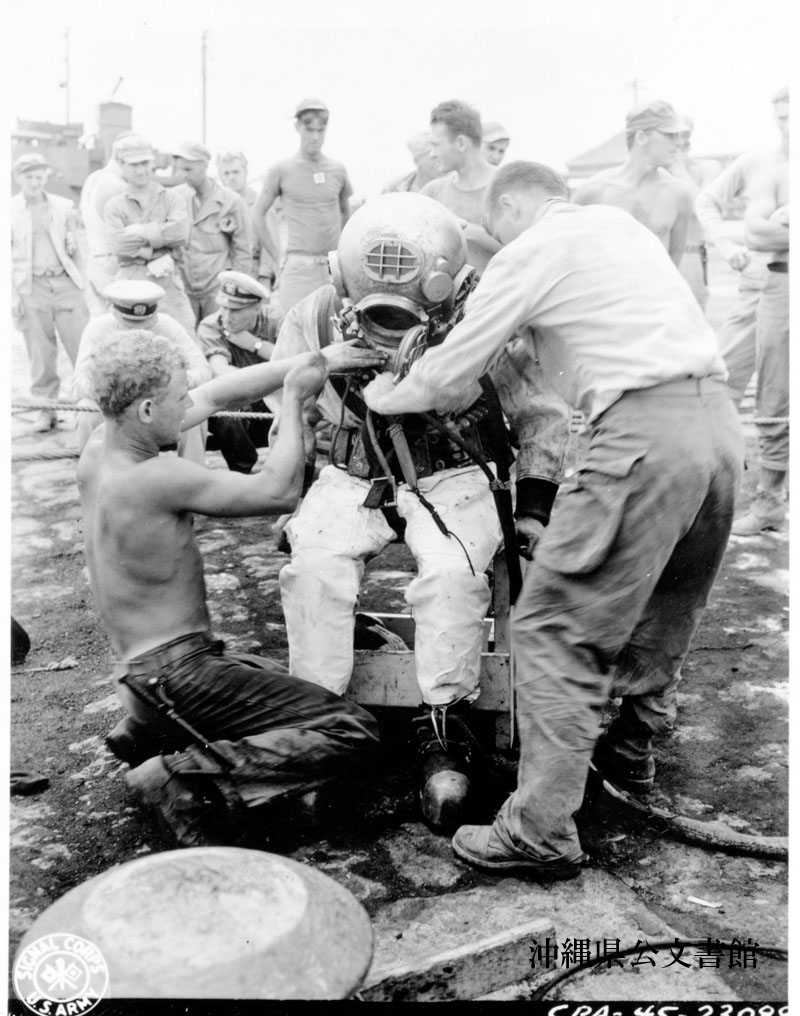 【和訳】 沈没した日本船舶の引揚げ作業で潜る前に陸軍のダイバーのヘルメットがきつく締められる