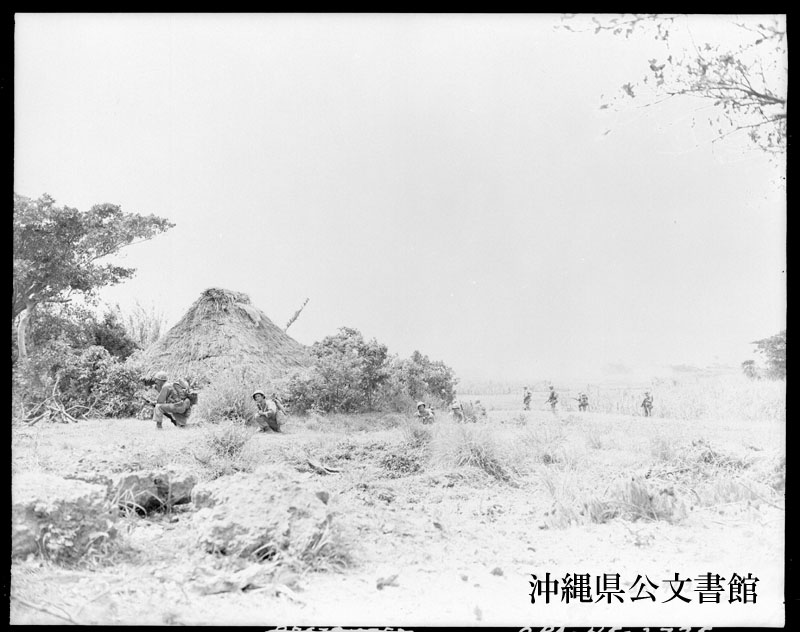 【和訳】 日本軍の隠された砲座の上を警戒しながら進む第96師団第382歩兵連隊第2中隊の兵士。