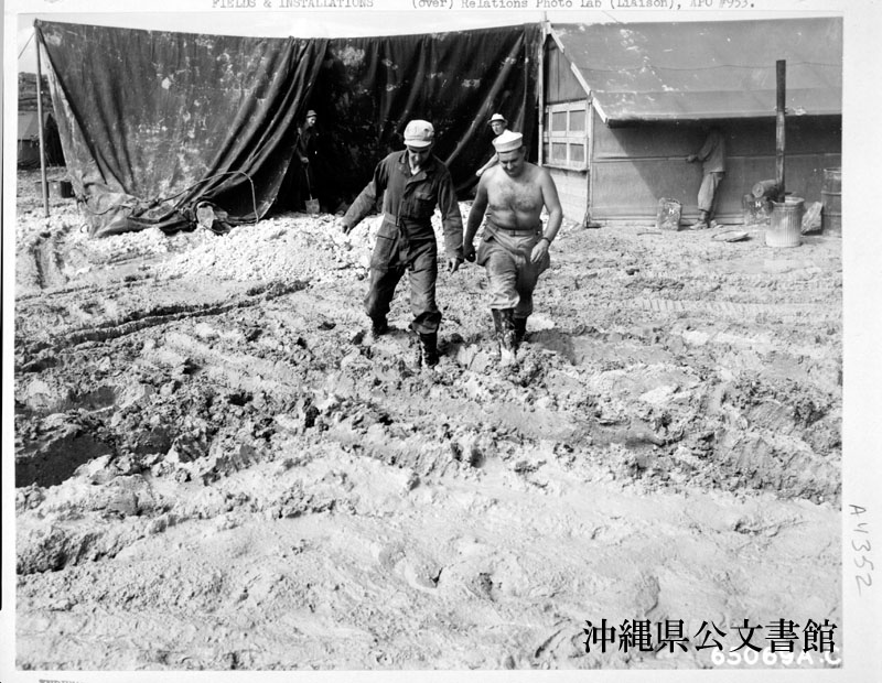 【和訳】 ぬかるみに足を取られてしまう第1878工兵航空大隊医療派遣隊隊員。沖縄。