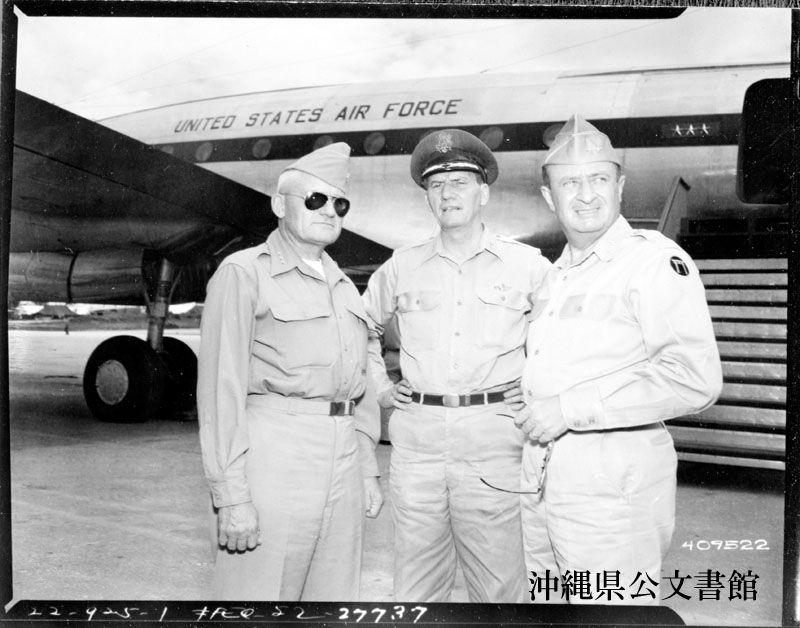 【和訳】 陸軍施設の視察のため沖縄に降り立った際、歓迎を受けるパーマー中将