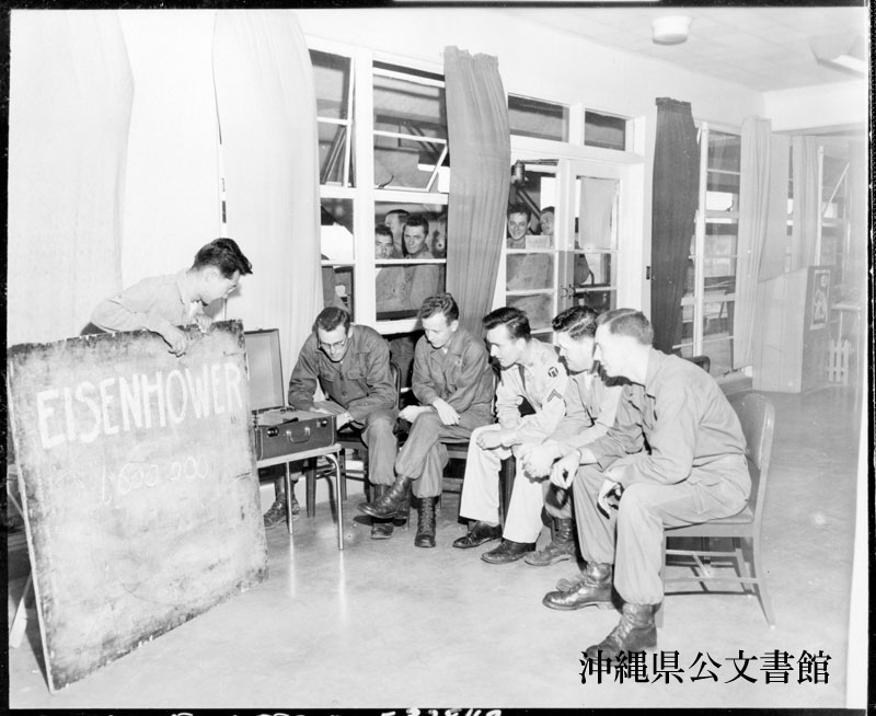 【和訳】 連隊娯楽室で大統領選挙速報を聞く第29歩兵連隊司令官や司令部の職員。左からムカイ伍長、スリンカー大佐、ルイス兵、キッタ上等兵、ハーツフィールド上等兵、ステイファンコ上等兵