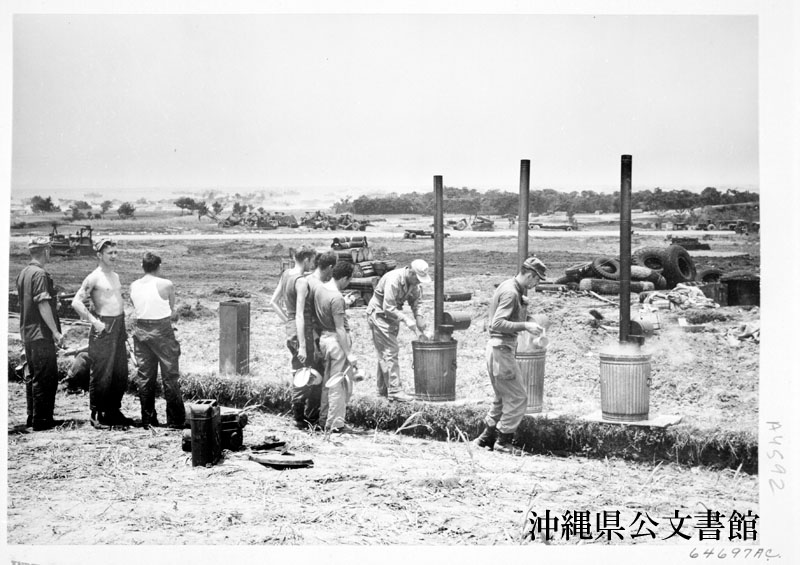 【和訳】 野外炊事用具を熱湯の入った大きなバケツで洗う第1878工兵航空大隊隊員。沖縄。