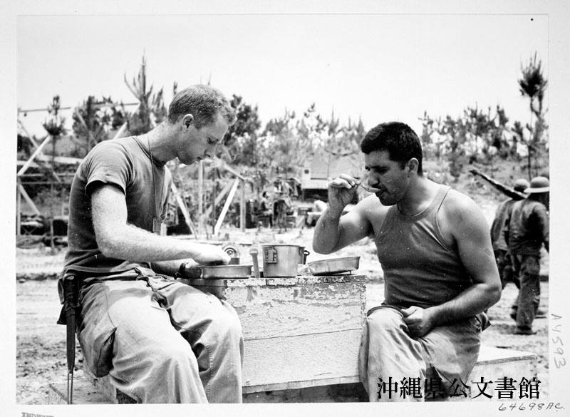 【和訳】 木枠をテーブルと椅子代わりにして昼食をとる第1878工兵航空大隊の二人の隊員。沖縄。