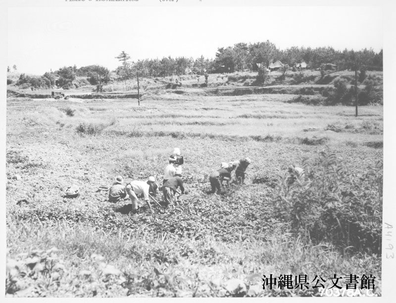 【和訳】 米軍政府病院近くの畑でイモを掘る沖縄人特別班。沖縄。