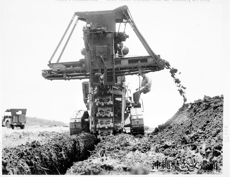 【和訳】 読谷飛行場へ電話線を引くのに利用された溝堀り機を操作する第443工兵航空大隊隊員メイソン四等技術兵。